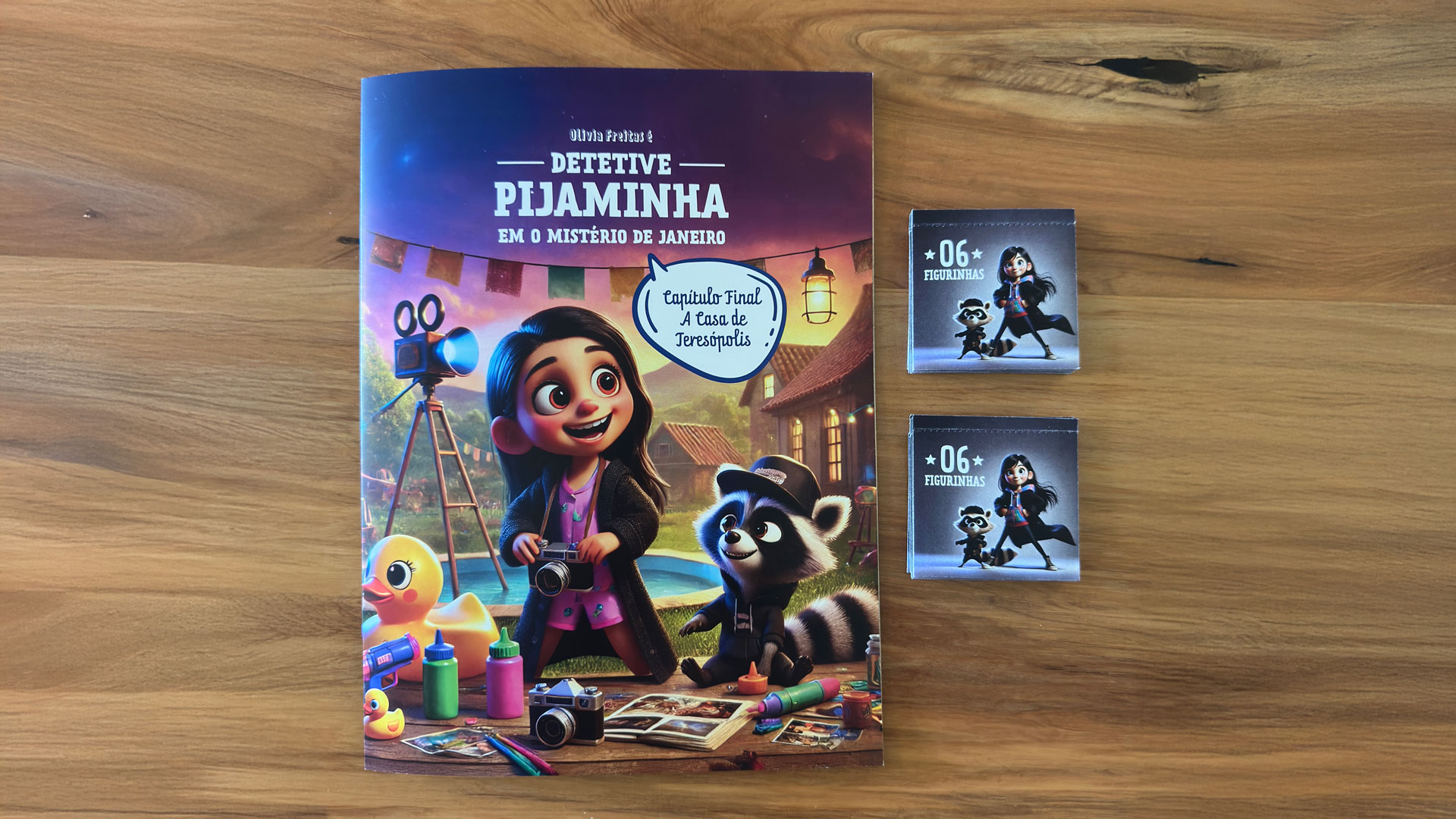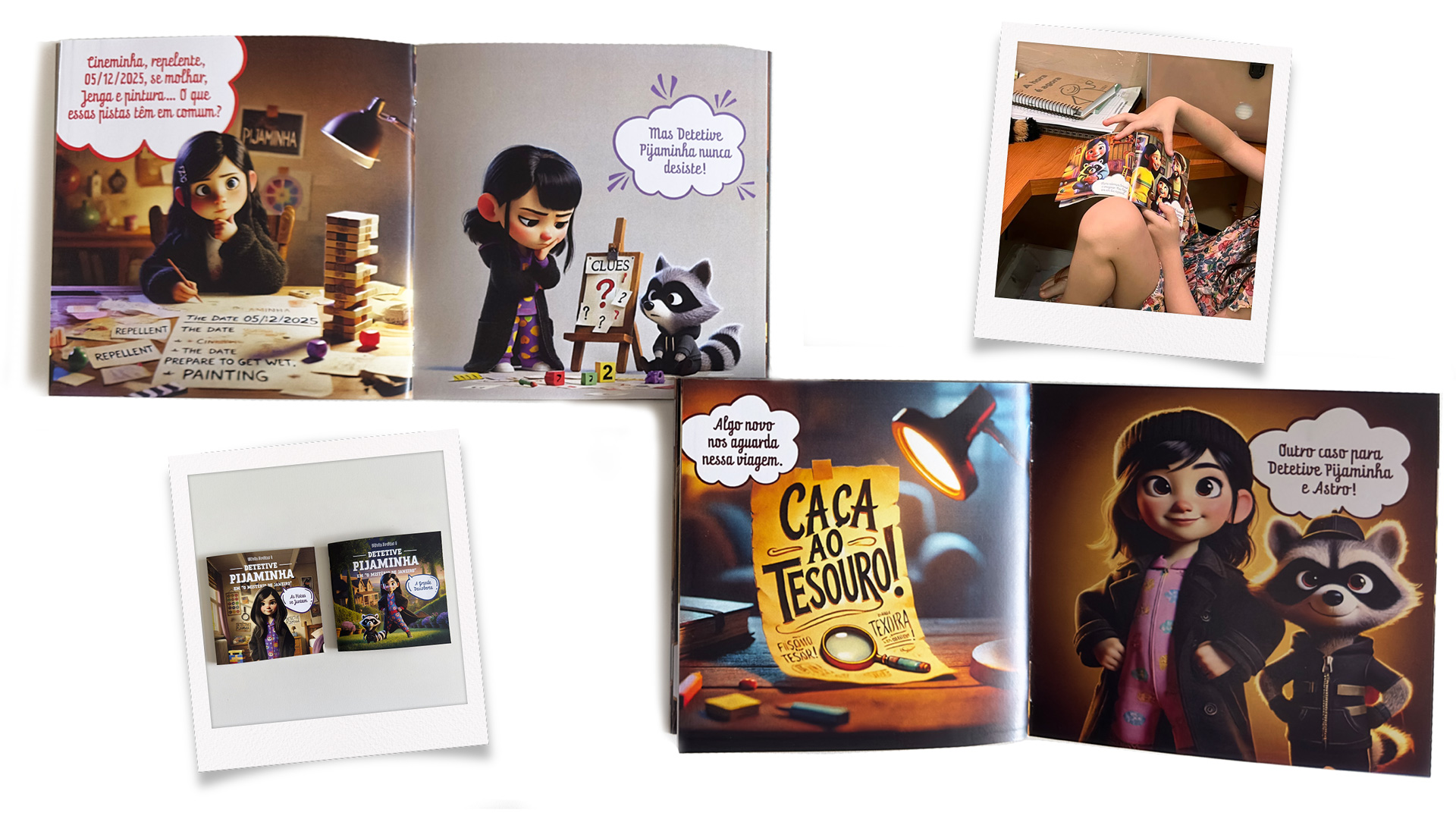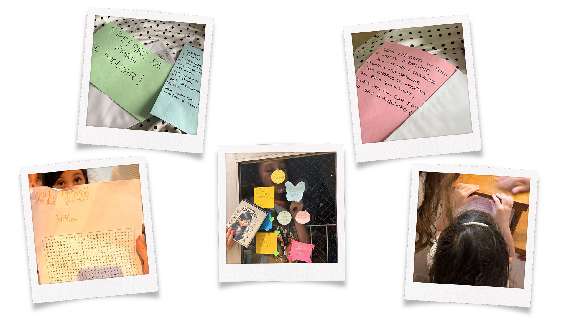 - Uma caça ao tesouro levando até o primeiro livrinho e terminando com seu kit de detetive