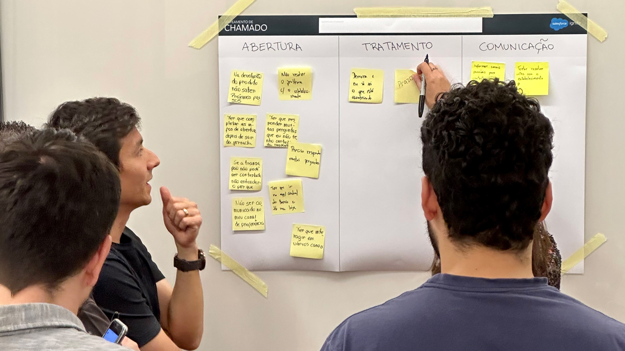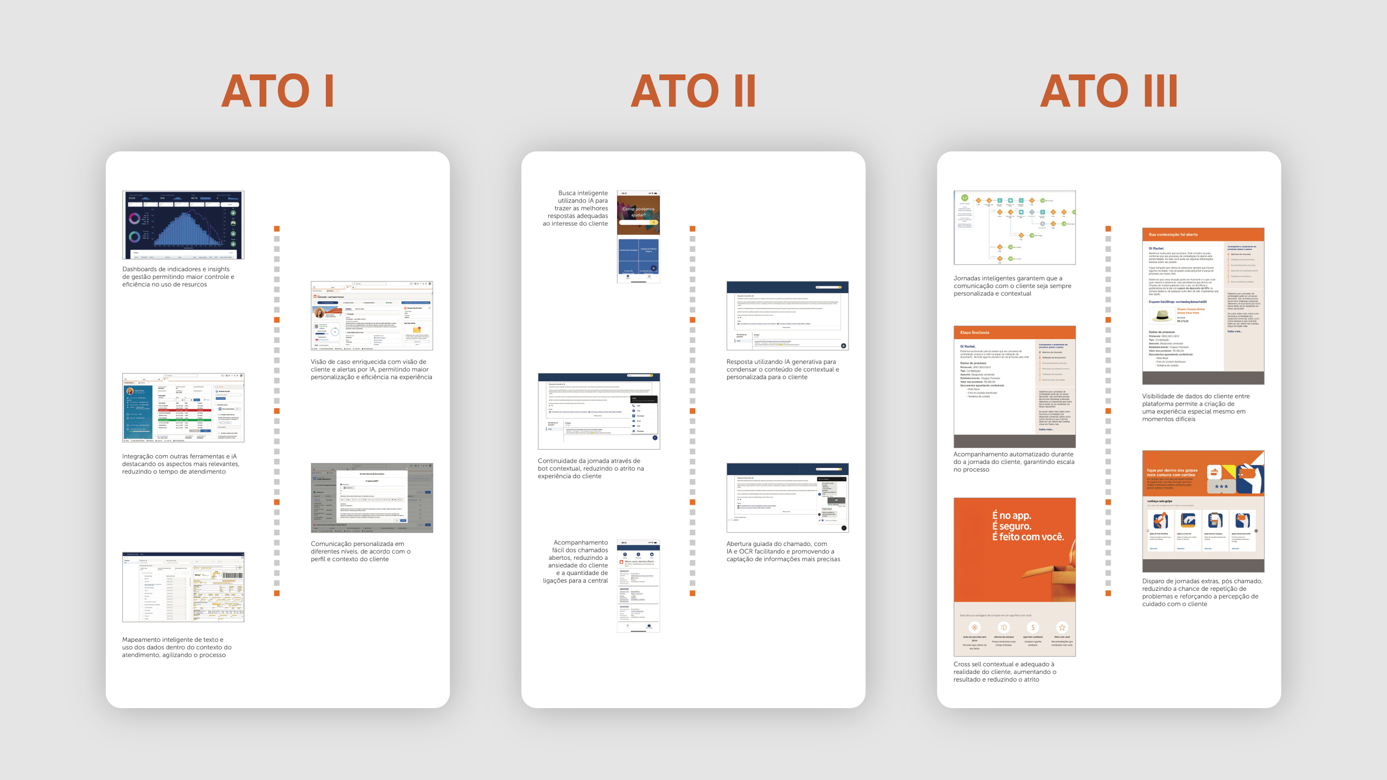 Após o alinhamento com os executivos, além de mais de 15 entrevistas com stakeholders, visitamos centrais de atendimento para conversar com agentes in loco, acompanhar o atendimento em tempo real e realizar sessões de cocriação. Algumas jornadas ideias foram prototipadas a partir do refinamento das criações feitas em um workshop de um dia inteiro com diversos envolvidos no projeto.